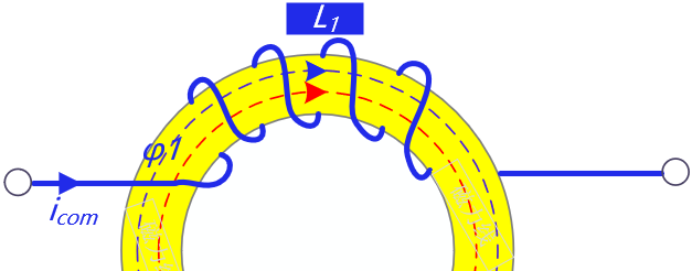 (2)共模电流通过共模线圈,磁力线方向相同,感应磁场加强,从如下图磁力线方向可以看出—实线箭头表示电流方向,虚线表示磁场方向