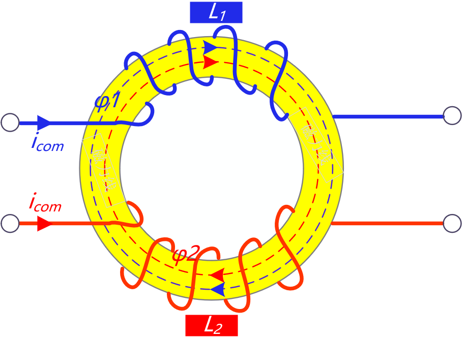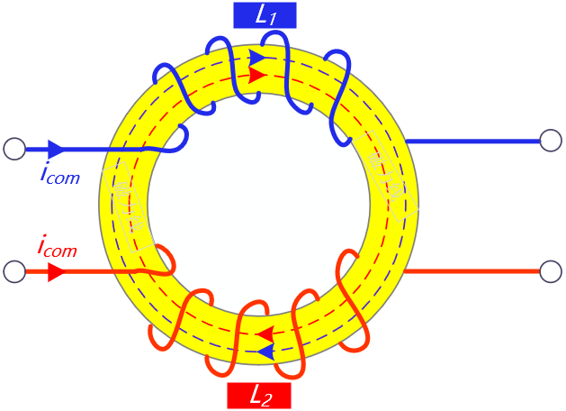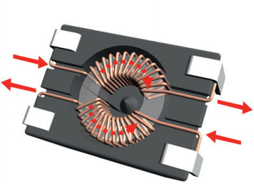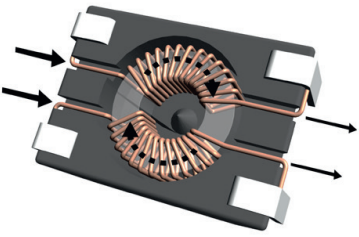 若在以某种磁性材料的磁环上绕上同向的一对线圈,当交变电流通过时,因为电磁感应而在线圈中产生磁通量。对于差模信号,产生的磁通量大小相同、方向相反,两者相互抵消,因而磁环产生的差模阻抗非常小;而对于共模信号,产生的磁通量大小和方向均相同,两者相互叠加从而使磁环产生了较大的共模阻抗。这一特性使得共模电感对于差模信号的影响较小而对共模噪声具有很好的滤波性能。