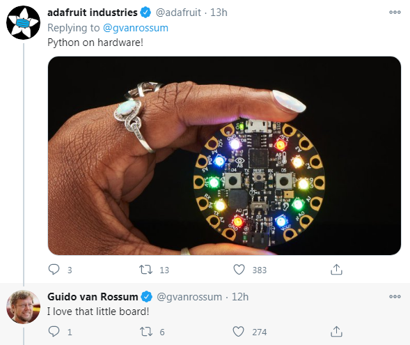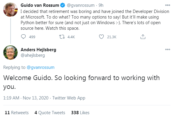 Van Rosum发推后,微软在回应中并没有透露他的项目安排。但从字数有限的推特内容中,我们可以得知:Van Rossum加入了微软的开发者部门。他表示能做的事情很多("Too many options to say”),而且可以肯定的一点是:他将与微软团队一起,使Python更好使用,且不局限于Windows系统。Van Rossum的一位粉丝在推特下回复,设想将Python用在硬件上,并得到了Van Rossum本人的回应!加入微软后,Van Rossum将给我们带来怎样的惊喜呢?让我们拭目以待。 参考链接:https://techcrunch.com/2020/11/12/python-creator-guido-van-rossum-joins-microsoft/https://blog.dropbox.com/topics/company/thank-you--guido