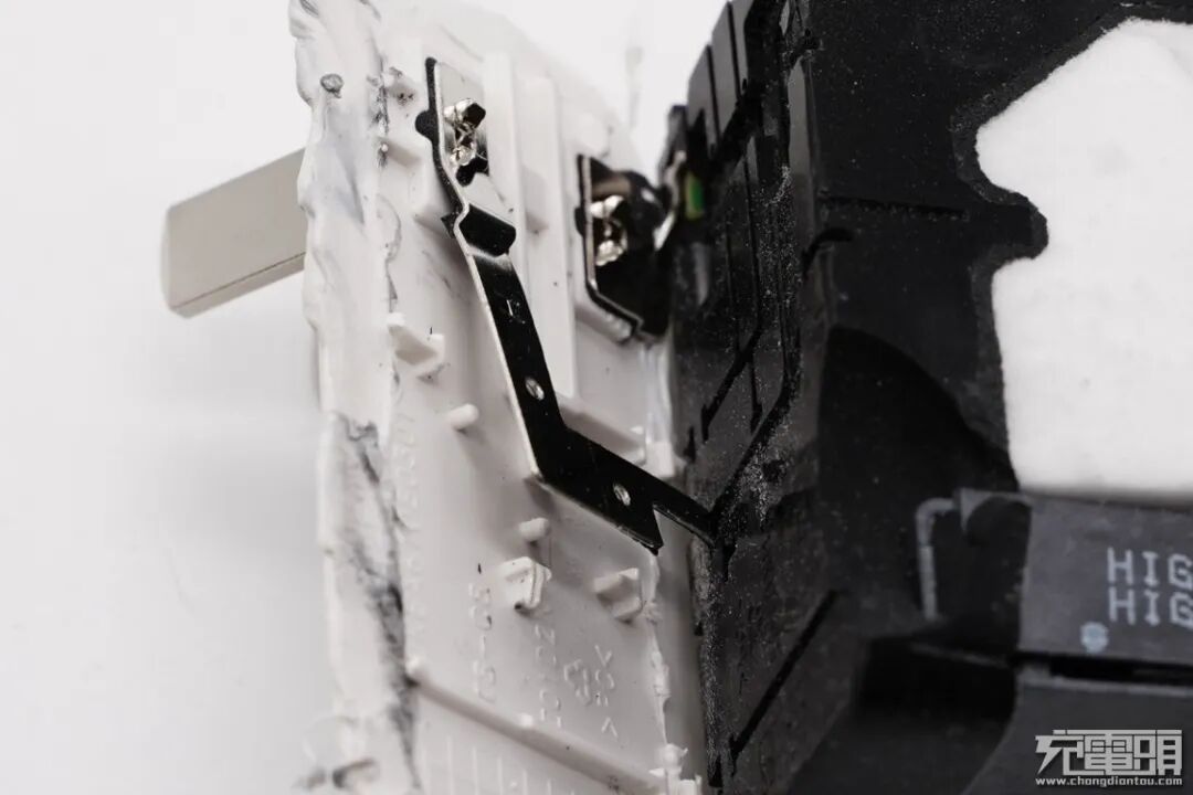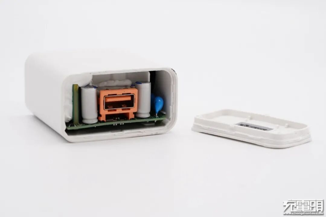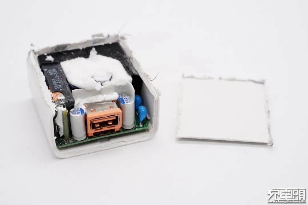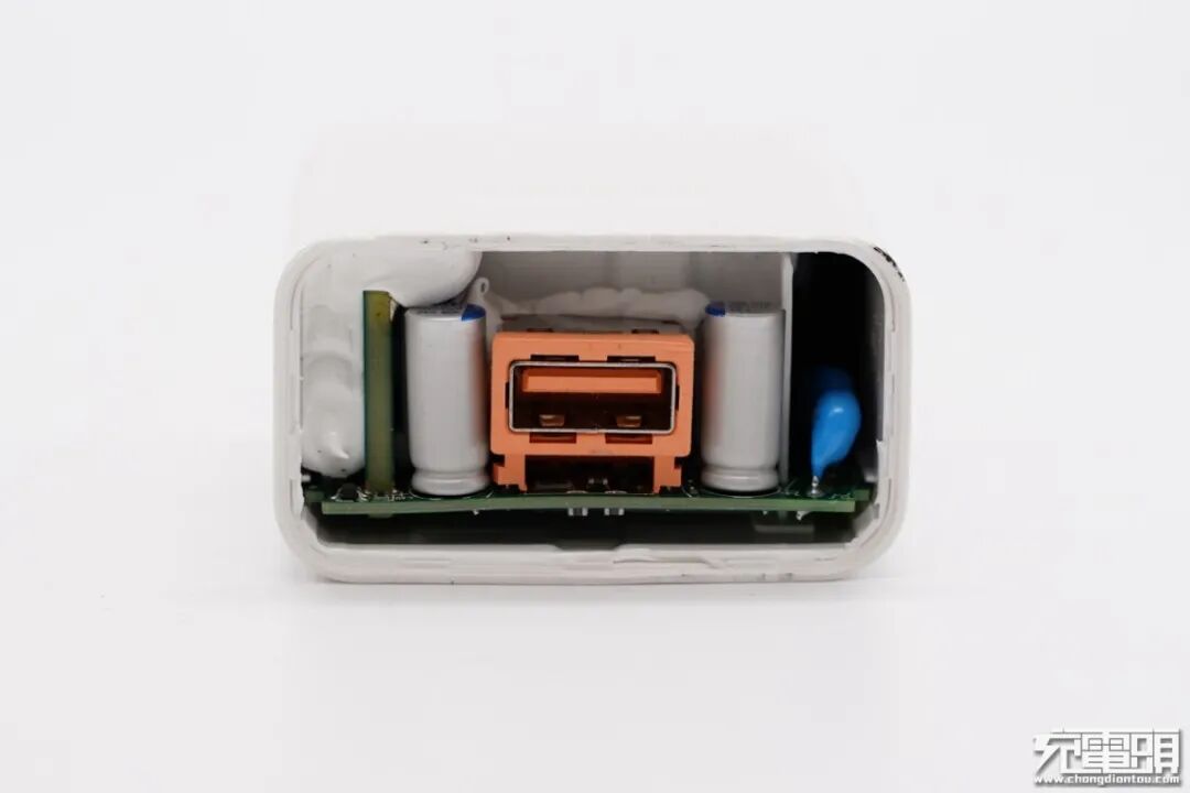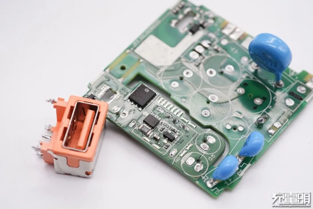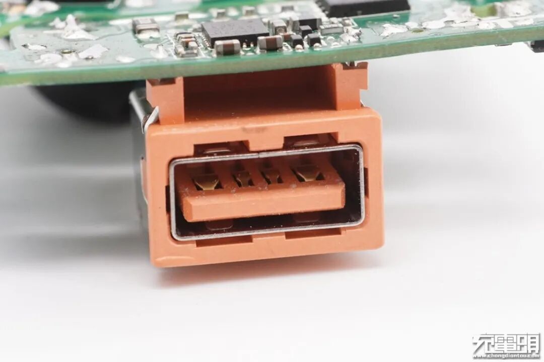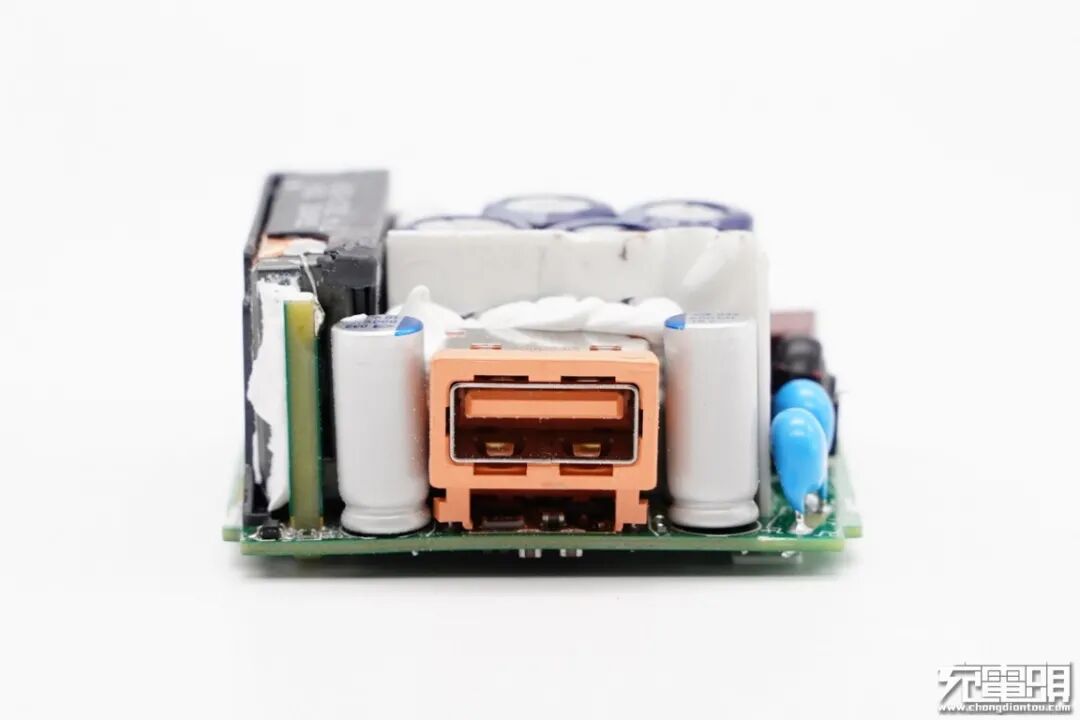 输出端一览,USB-A母座外套塑料壳和钢套加固,两侧设有Y电容和固态电容。
