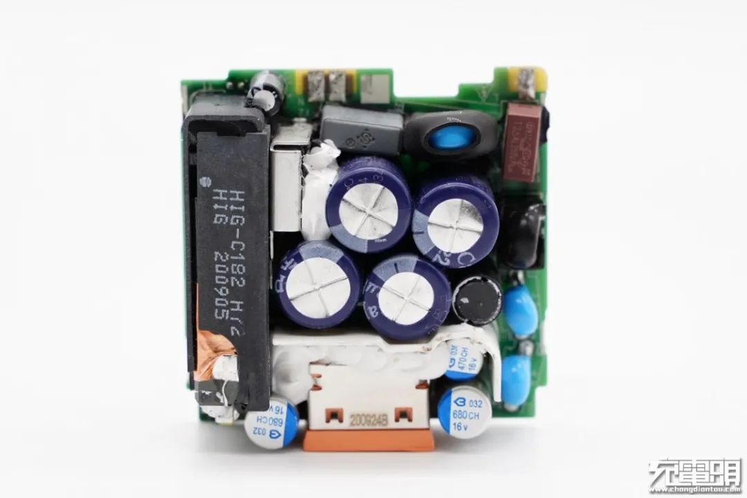 将硅胶清理掉,板子中心处是四颗高压滤波电解电容,左侧设有平面变压器,初次级之间设有白色隔离板。