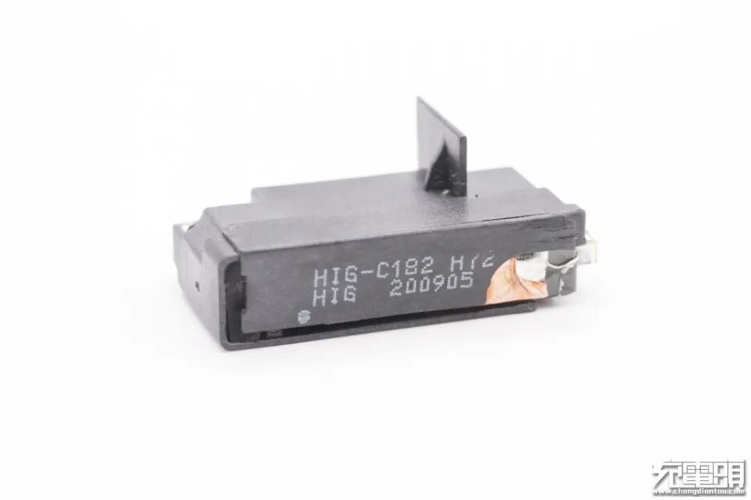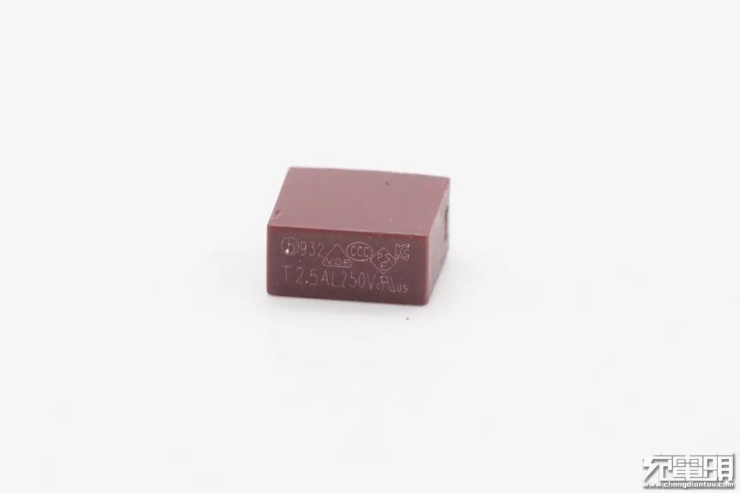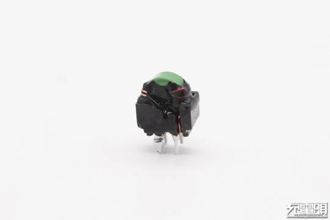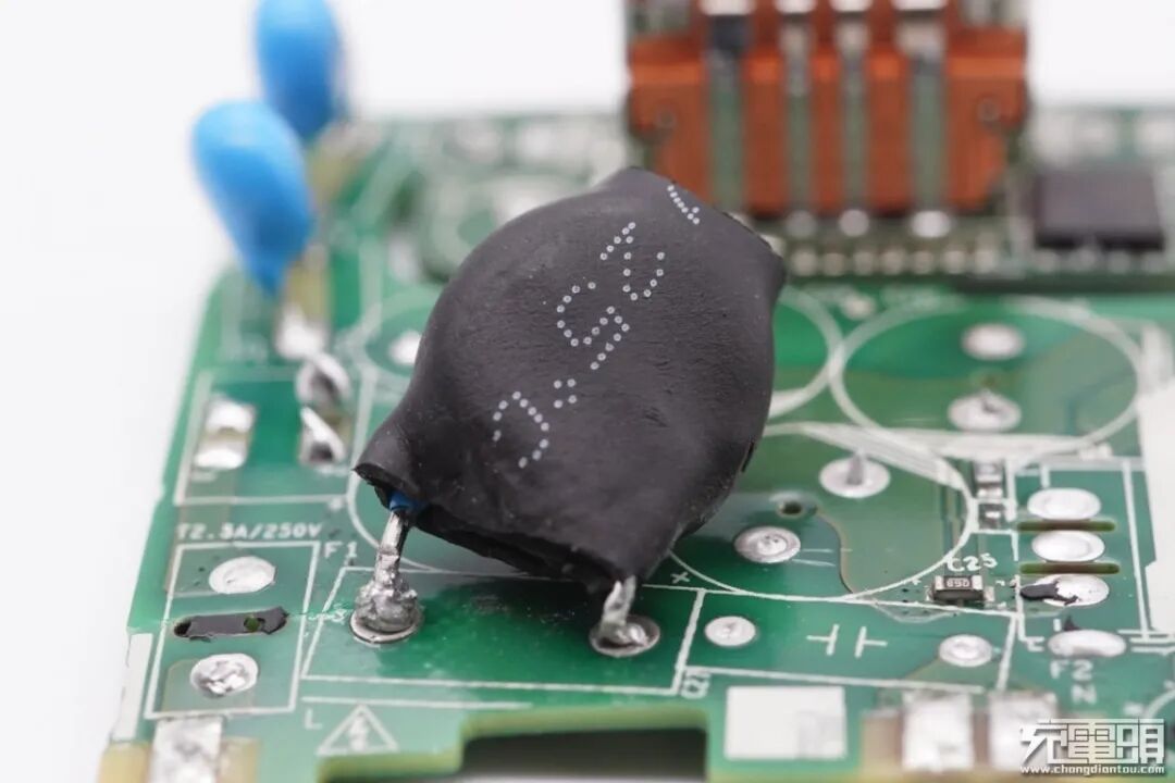PCB板侧面一览,两颗串联的Y电容,共模电感,输入保险丝。