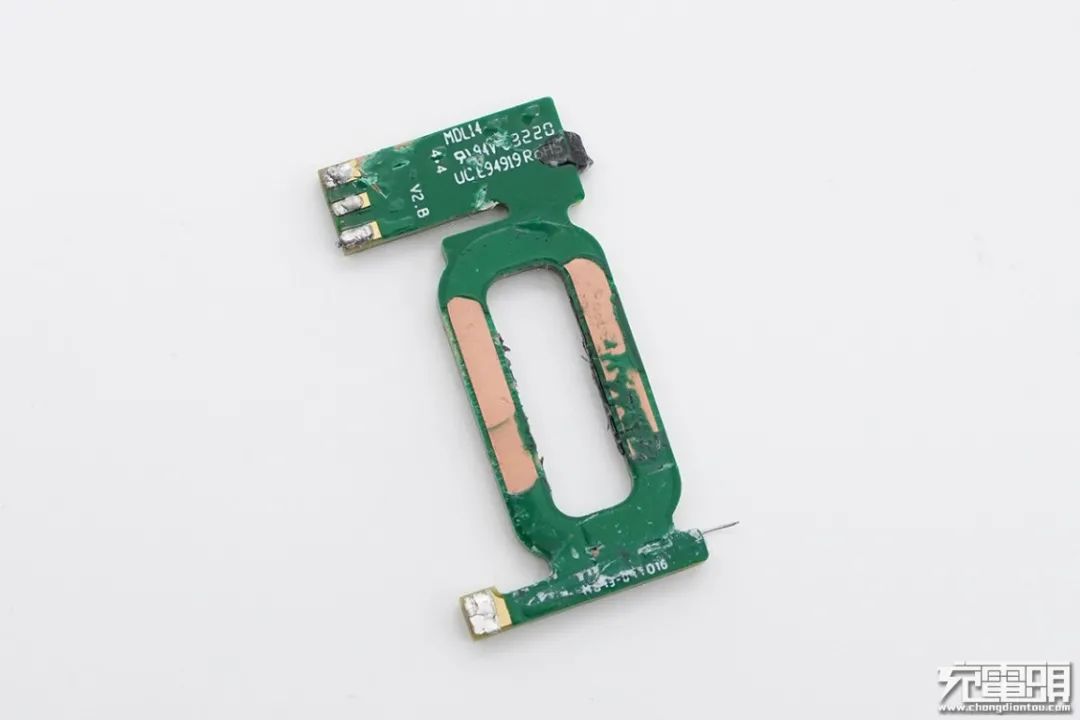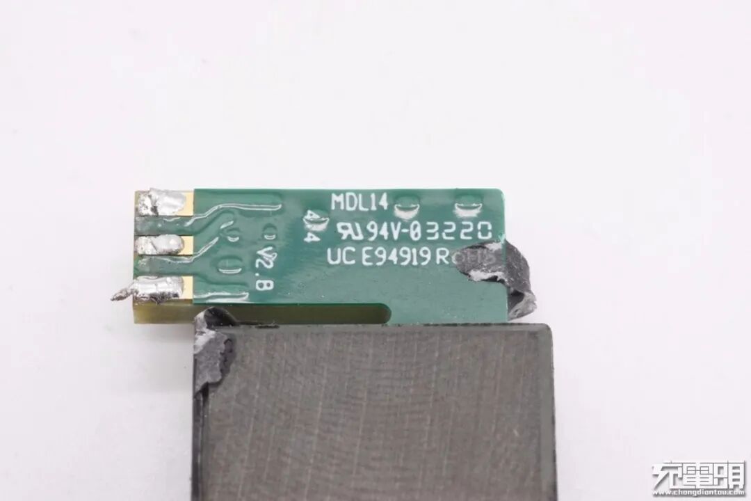小板一端特写。通过对PCB板上UL型号(E94919)进行查询,此款平面变压器PCB来自湖南维胜科技电路板有限公司。
