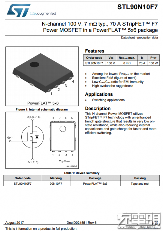 次级同步整流MOS来自ST意法半导体,型号STL90N10F7,NMOS,耐压100V,导阻8mΩ。