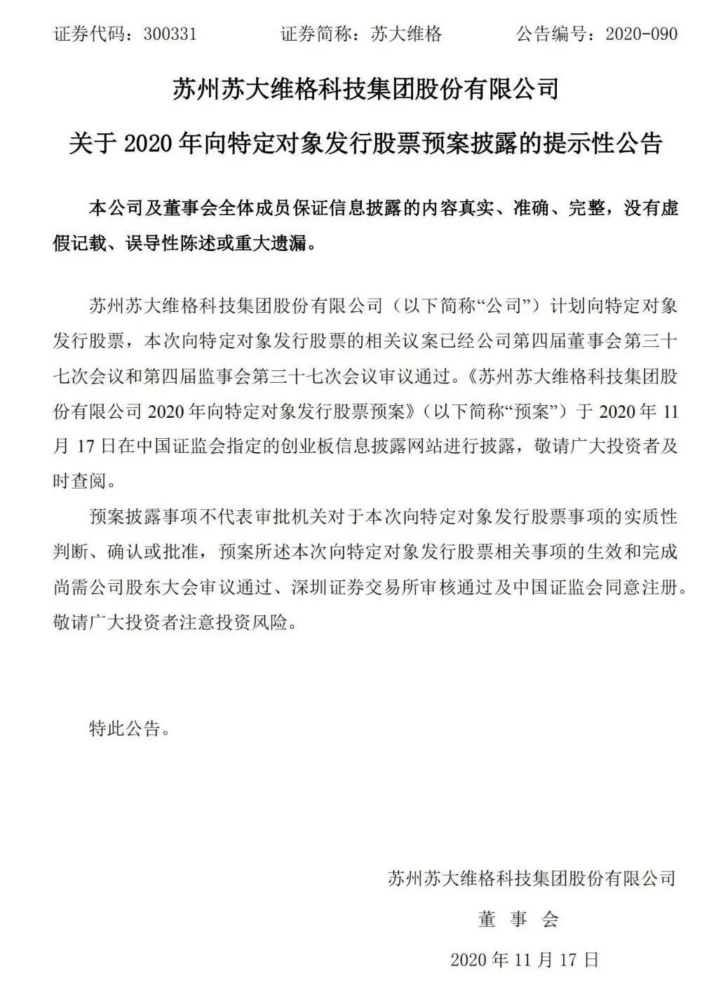 11月16日晚,苏大维格发布了新的定增预案,发行对象调整为不超过35名特定对象,发行价格也由24.5元/股的锁价发行改为“根据竞价结果与保荐机构协商确定。”