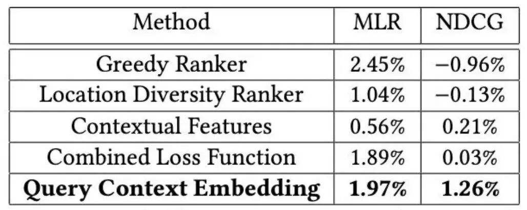 Query Context Embedding方法:在线NDCG增加1.2%,预定量增加0.44%,新用户预定量增加0.61%,说明多样性对新用户很重要。