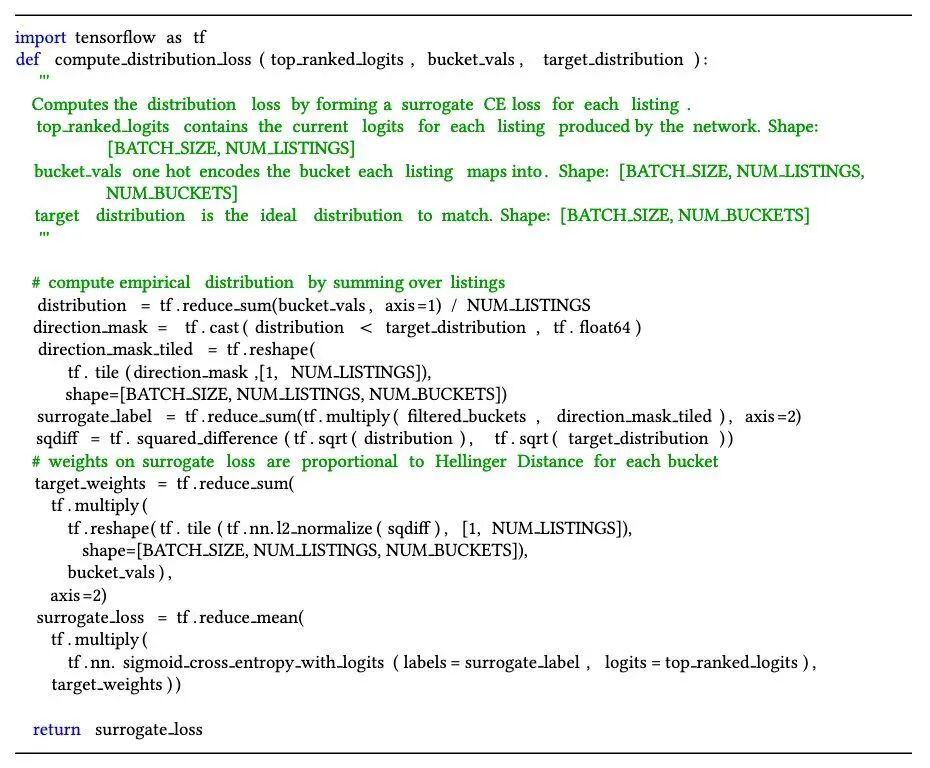 但是,直接使用Hellinger距离作为loss function是不可行的:因为每个listing对应的bucket是常数,和DNN的权重没有直接依赖,所以无法用SGD优化。因此,作者提出了一个巧妙的surrogate cross entropy loss function来解决这个问题。即对于每个bucket,可以用一个binary label来表示这个bucket的分布值是否低于目标值。对于每个listing —— cross entropy loss的权重和该bucket的分布值与目标值的差值成正比。如果一个listing对应到某个bucket, 这个bucket上的值超过了理想值,重排序网络权重就会调整来减少这个listing的得分,使得这个listing排名到top T以外,bucket上的值进而就会接近理想值。