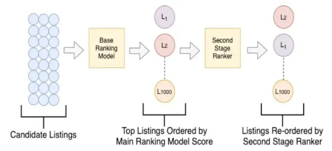 重排序阶段,多样性的优化方面,工业界搜索推荐系统实用的代表性方法,包括 MMR (Maximal Marginal Relevance)[1], Google Youtube和Hulu视频推荐中的DPP(Determinantal Point Process)[2,3],阿里电商推荐中基于Transformer的PRM [4],Google Youtube基于强化学习的模型SlateQ [5]等。Airbnb的搜索系统,主要包括:召回、精排(Base Ranking Model)、重排(Second Stage Ranker),这篇论文主要介绍Airbnb搜索在重排序阶段如何优化多样性问题。