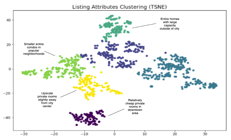 本文中,作者使用的是将listing人工定义为一个可解释的向量,由listing的属性来表示,例如价格,位置(经度,纬度),容纳人数,房间类型等。对于实数值属性,基于query结果集合中的数据(而非全部数据)计算均值、方差,做normlization。对于类别属性,使用one-hot encoding。对处理后的listing向量通过TSNE聚类,结果如下图所示,可以看到:这种表示聚类效果很好,对房间类型、价格、位置等信息有比较好的区分度。