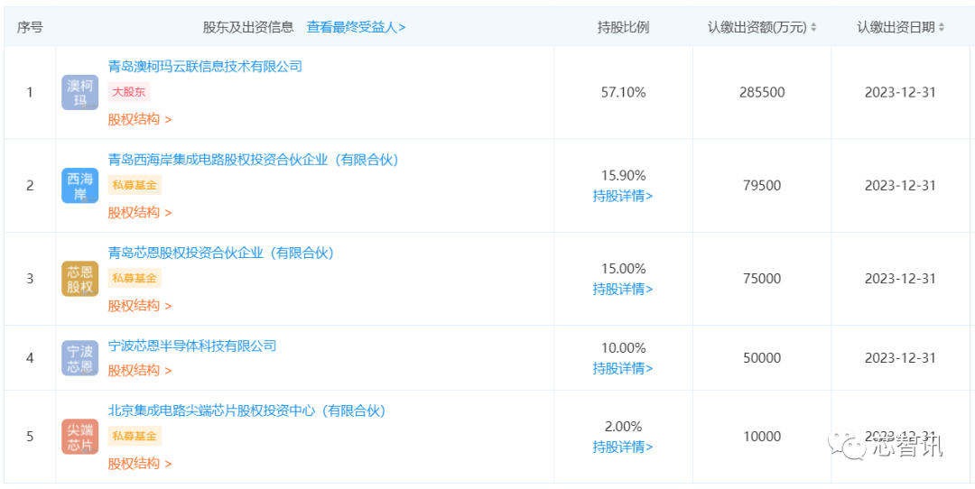 11月20日消息,根据企查查资料显示,近日,芯恩(青岛)集成电路有限公司(以下简称“青岛芯恩”)发生股东变更,“青岛兴橙集电股权投资合伙企业(有限合伙)”(以下简称“青岛兴橙集电”)退出,新增“青岛澳柯玛云联信息技术有限公司”,其中青岛澳柯玛云联信息技术有限公司(以下简称“澳柯玛云联信息”)持股比例达57.10%。