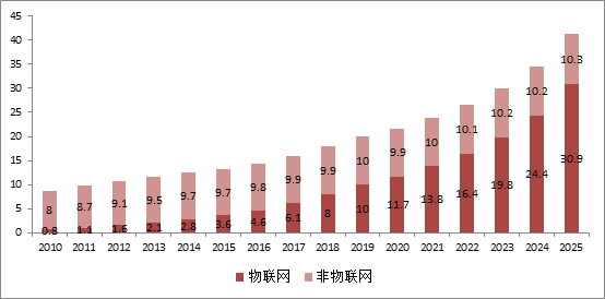 从监测数据来看,2010年物联网连接数为8亿,而此时非物联网设备为80亿。但此后10年,物联网连接数高速增长,而非物联网连接数仅有微小的增长,到2020年物联网连接数达到117亿,而非物联网连接数保持在100亿左右,这是物联网连接数首次超越非物联网连接数。预计到2025年,物联网连接数将增长到309亿,而非物联网连接数仅有103亿,几乎原地踏步。