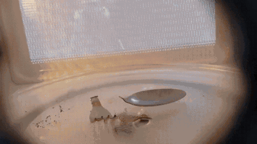 微波在炉内四处反射,但无法逃脱。这样微波的能量便可以集中起来,让食物吸收。虽然微波炉不是个完美的法拉第笼,但一款合格的微波炉泄露出去的微波强度远不及阳光的辐射强度,所以你大可不必担心自己被微波“煮熟”。然而,在一些特定情况下,金属会把你的微波炉变成一个灾难现场。金属内部有许多能自由移动的电子,它们在变化的电磁场中会重新分布。当电势差积累到一定程度,就可能像夏天的积雨云那样,产生闪电。