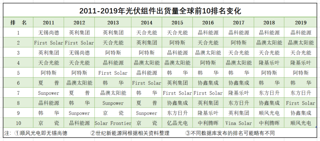 在晶科进入光伏行业这一年的12月(2006年12月),常州人高纪凡创立的天合光能(下称“天合”)已经在纽约证券交易所上市,而这段上市之路,高纪凡走了10年。上市后有了充足资本的高纪凡,在2007年多晶硅价格暴涨时,也曾为此动心,甚至已经在连云港规划了一个一万吨产能的多晶硅厂,但考察一番后的他很快停止了上马新项目的冲动,这一脚刹车踩下去,让天合成功避免了随后的“撞车事件”。2012年,欧美“双反”来势汹汹,国内光伏企业人心惶惶,眼见危机来临的高纪凡立即行动,通过外包海外企业生产组件的形式绕过关税壁垒,不但让天合转危为安,而且顺利实现转型,从“全球一流的光伏组件制造商”的1.0时代,走向“全球领先的太阳能整体解决方案提供商”的2.0时代,在激烈的市场竞争中站稳了脚跟,并保持了领先优势。2014年,天合实现正利润;2015年,天合销售收入突破30亿美元,出货量达5.74吉瓦,光伏组件累计出货量已接近17吉瓦,全球市场份额超过10%,连续两年保持光伏组件出货量全球第一。2017年,天合全球光伏组件出货量9.0—9.2GW。根据PV-Tech公布的《Top-10ModuelSuppliersin2017》(《2017年全球十大组件供应商》)排名,天合光能继续稳居第二名,累积出货量超过32GW,继续保持全球第一。走上稳步发展之路后,天合光能在全球布局了七大制造基地。2020年三季度初,江苏宿迁、浙江义乌两大制造基地同步投产500W+至尊超高功率组件;7月29日,天合光能义乌制造基地一期4GW组件投产,二期 4GW组件奠基;此外,天合光能还将投资近25亿元建设“年产能10GW高效光伏组件及光伏衍生产品项目”,投产后预计年销售收入135亿元左右。在电池方面,天合光能投资近38亿元建设10GW高效210mm大尺寸太阳能电池项目。预计到2021年底产能达到26GW左右。2020年10月28日,天合光能发布2020年第三季度财报,收入与利润均稳步提高。前三季度合计实现营收199.26亿元,同比增长18.66%,其中三季度实现收入73.8亿元;实现归属于上市公司股东的净利润8.32亿元,同比增长118.94%。如果说高纪凡的“一脚刹车”成就了现在的天合,那么瞿晓铧的稳健“倒三角”经营模式,则让阿特斯多次避过了行业险滩。2002年1月,瞿晓铧接下了德国大众的第一批太阳能充电器订单,总价几百万美元,被要求4个月内交货。带着抵押多伦多房产所获得的贷款,瞿晓铧只身一人回到了老家常熟,组建团队准备生产,掘到了人生第一桶金。打响了第一炮之后,接下来两年阿特斯的销售额基本维持在300万美元左右。2004年,因为从生产离网组件成功转型为生产并网组件,阿特斯的销售额首次突破了1000万美元。转型完成两年后的11月9日,阿特斯在纳斯达克上市,成功融资1.55亿美元,成为国内首家在美国纳市上市的太阳能光伏企业。尽管上市后可以融到更多的资金,但在经营模式上,瞿晓铧始终坚持“倒三角”模式,即产能依据产业链位置布置,越往上游产能越小,上游产品基本全部自用并保留较大比例的缺口,来增加其面对风险时的抗力。采购中,阿特斯也尽可能的采用短期协议采购,避免长单采购。得益于这样的“倒三角”模式,2008年硅料危机、2012年欧美双反、2018年531,几次“大劫”中,阿特斯都是受波及最小、稳坐钓鱼台、甚至成为了逆流而上的企业。财报数据显示,截至2020年6月30日,阿特斯硅锭、硅片、电池片和组件产能已分别达到1,850兆瓦、5,000兆瓦、9,700兆瓦和13,950兆瓦。在瞿晓铧接下公司第一笔订单的2002年,正在做有机玻璃生意的林晓峰人生中也第一次接触到了太阳能灯具。当时一位海外客户询问林海峰能否做太阳能灯具,正在寻找新出路的林海峰眼睛一亮,敏锐地察觉到蕴藏在太阳能灯具里的巨大商机。经过一番市场调查,考虑到太阳能灯具和有机玻璃管行业链相近,技术相仿,林海峰决定进行产业链延伸,生产太阳能灯具。2002年,林海峰成立了宁海县日升电器有限公司,成为国内最早进入太阳能光伏应用行业的企业之一。2005年,销售业绩突破亿元;2006年,技术总监唐坤友加盟,开始兴建第一条太阳能电池片生产线;2008年,塔山工业园生产基地落成,东方日升在制造规模、研发实力等方面跃上新台阶;2010年9月2日,登陆创业板;2014年—2017年,从不到30亿营收的中等规模企业,迅速壮大为营收超过100亿的大型企业,荣耀挺进全球光伏前六,净利润也从过去的7000万元跃升过5亿;2018年5月,宣告实施“两新”战略:持续发力新能源和新材料两大领域,形成“电池组件、储能、新材料”的一体两翼的业务格局;2019年,营收144.125亿元、营利8.43亿元、利润总额11.45亿元、净利润9.8亿,所有数据全部成为史上第一。2020年,东方日升再接再厉,与义乌经济技术开发区分别签署了15GW高效电池及组件、智能接线盒及辅材、斯威克年产3亿平米胶膜三个项目的投资协议。2011—2018 年的光伏龙头企业,发展变化相对较慢。2011 年的行业龙头无锡尚德,如今已经排名十名以外,而晶科能源、天合光能、阿特斯等行 业排名较为稳定。当然,由于统计口径的不同,个别顺位有所不同,但是差距不大。进入后浪时代,光伏行业迎来了新的变化,强者恒强,前十排名日益固化。新进入者很难再打破固有的市场格局。以2019年全球组件出货量为例。在GlobalData官方网站发布的全球组件出货排行榜中,前十名企业出货量为80.3GW,中国企业占据前十位中的八席,总出货量为67.5GW,占比84.06%。晶科位居第一,出货量