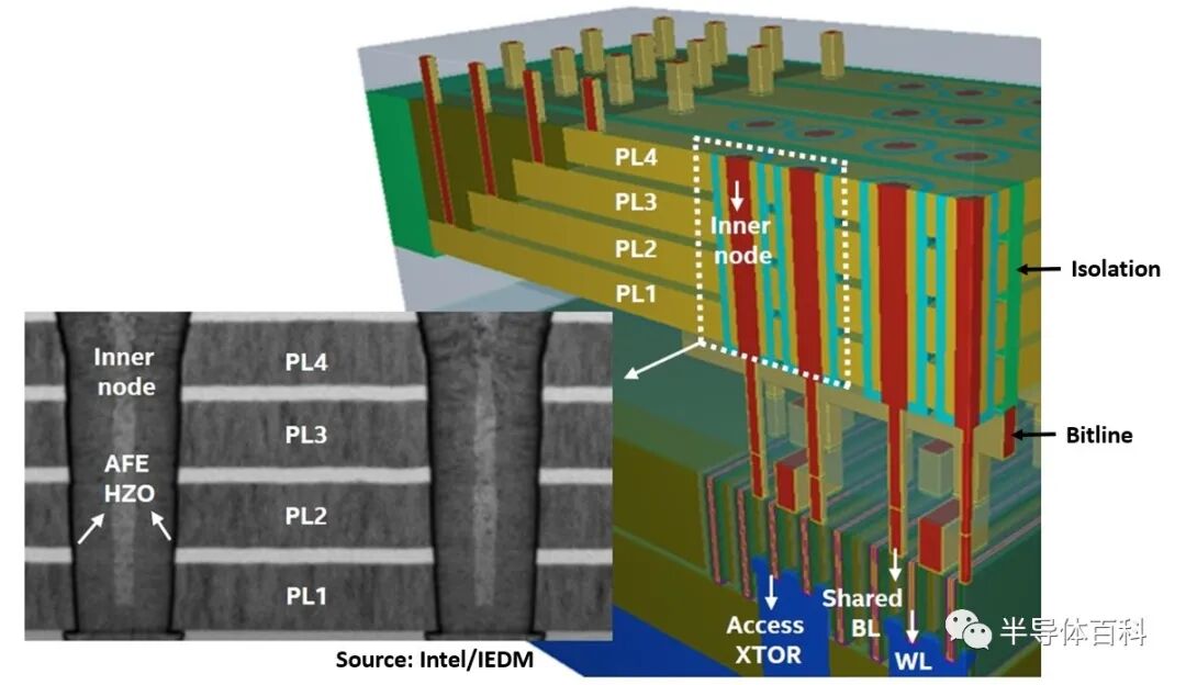 在下图显示的1T-4C堆栈中,公共极板似乎已移到电容器的外部,并且我们围绕着各个内部节点板有四个水平放置的极板(PL1-PL4)。该示意图表明,电容器的布局就像DRAM,两个电容器通过一对字线连接到共享位线。电容器已被隔离沟槽分成几行,公共极板通过阶梯结构接触,就像3D NAND堆栈一样。