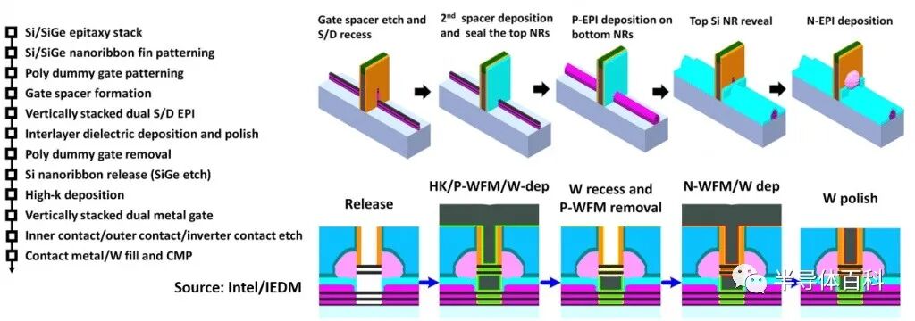 请注意,下部的PMOS纳米片保持完整,但顶部的NMOS纳米片被去除(除了栅堆叠之内),然后N-epi在纳米片的根部上生长。使用的双重功函数材(WFM)需要先沉积P-WFM和钨(W),然后将W回蚀刻至N纳米片之下,而W覆盖P纳米片。然后形成N-WFM层,然后进行最终的W沉积和CMP。栅极长度≥ 30nm 时,W栅极填充应该没有问题。