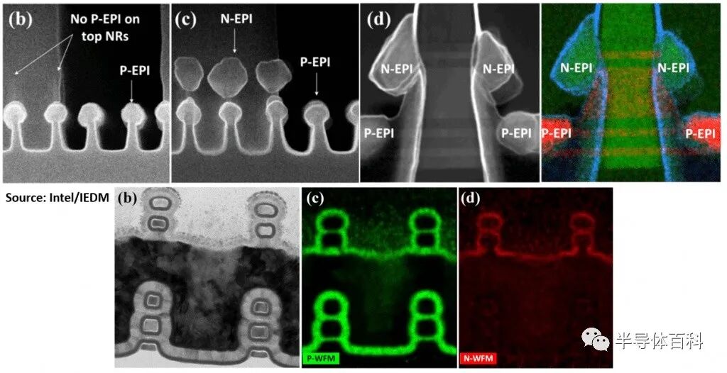 上方第一行的SEM图像(b)显示了在底部纳米片上选择性生长的P-epi,然后图(c)显示了在顶部两个纳米片上选择性生长的N-epi。(d)中的正交视图具有SEM和SEM / EDS图像,这些图像显示了堆叠的纳米片晶体管上选择性的N-epi和P-epi生长。