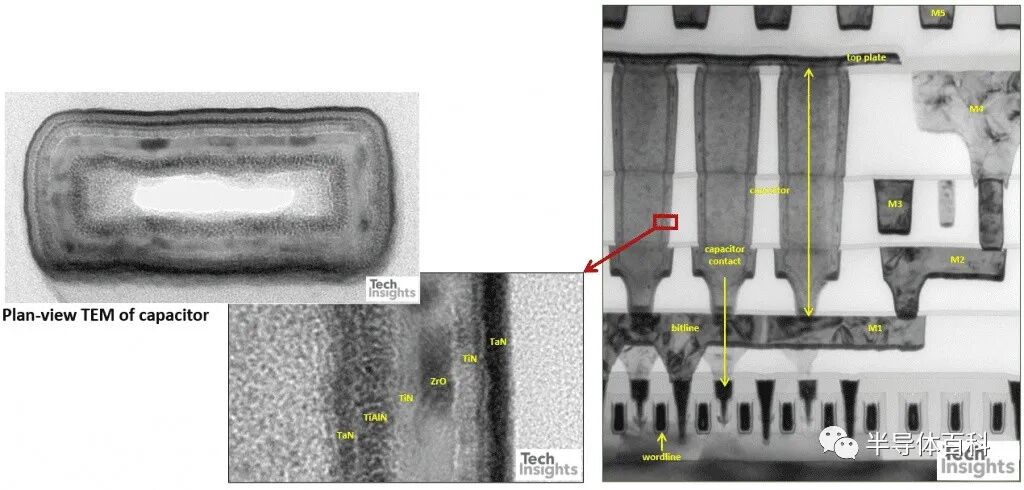 在上面的TEM图像中,左侧是IEDM文章中的暗场,右侧是我将其反转为明场,标记了晶体管元件,并优化了对比度以尝试阐明我们在看什么。触点上方的垂直条纹是TEM样品制备技术的伪影。电容器本身在晶体管上方,因此尽管它可能是沟槽形的,但它不是常规的沟槽电容器(在基底中,IBM一直使用到14nm节点)。