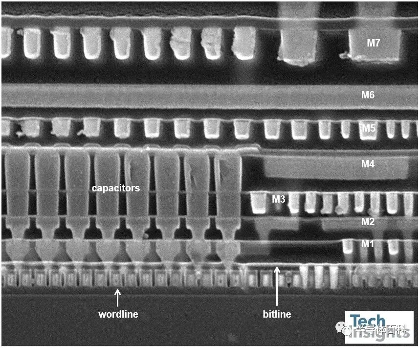 电容器中心的钨塞很可能已连接到公共极板(common plate)上,尽管此处未显示。栅极的形状表明它是一个FinFET晶体管,但是我看不到任何鳍,所以也许这个样本是在场区拍摄的。这实际也是查看诸如栅极和电容器堆栈之类的结构的有用方法。