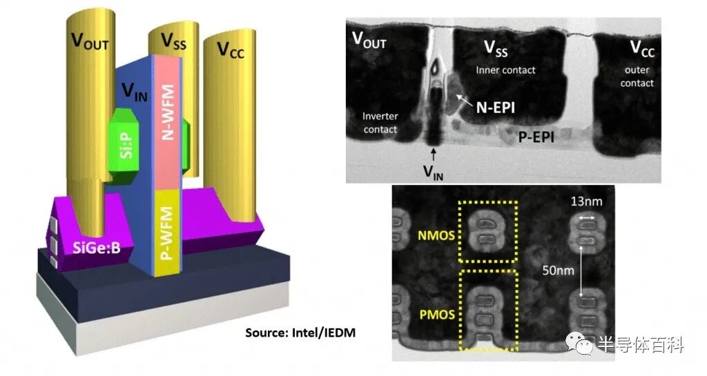 使用垂直堆叠的双源极/漏极外延工艺,以及双金属栅极,可以同时调整P和N纳米管以及Vt。这提供了出色的静电特性–亚阈值摆幅小于75 mV/decade,而DIBL小于30 mV/ V(对于≥30 nm的栅极)。在下图中,左边为反相器的示意图,在右边的右上角是栅极的TEM横截面,下方是P-epi沟道,上面是N-epi的沟道。右下方是垂直沟道方向的截面图,显示了嵌入其中的N和P沟道。栅极长度为40 nm,我们可以看到纳米片宽度为13 nm,我估计约厚度约为5 nm。