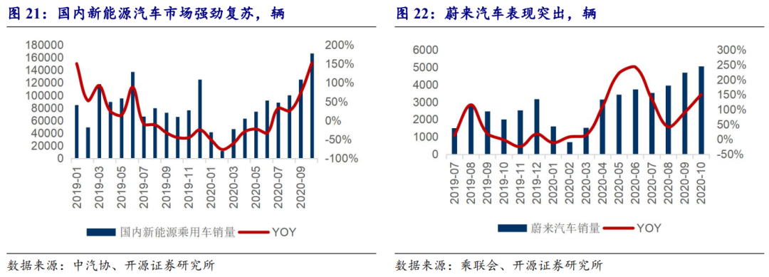 国内新能源汽车市场需求逐步回暖,新势力表现突出。受补贴退坡和新冠疫情影响,2019H2-到2020H1,国内新能源汽车市场表现低迷。随着国内对新能源汽车支持力度的加大,包括购置税减免延长两年、新能源汽车下乡等政策的出台,疫情后需求的逐步回暖,国内新能源汽车市场在7月开始强劲复苏。中汽协数据显示,2020年10月,国内新能源乘用车销售16.7万辆,同比增长152.6%。其中新势力表现突出,蔚来汽车10月销量5055辆,同比增长150.4%,2020年1-10月累计销量大增93.1%。
