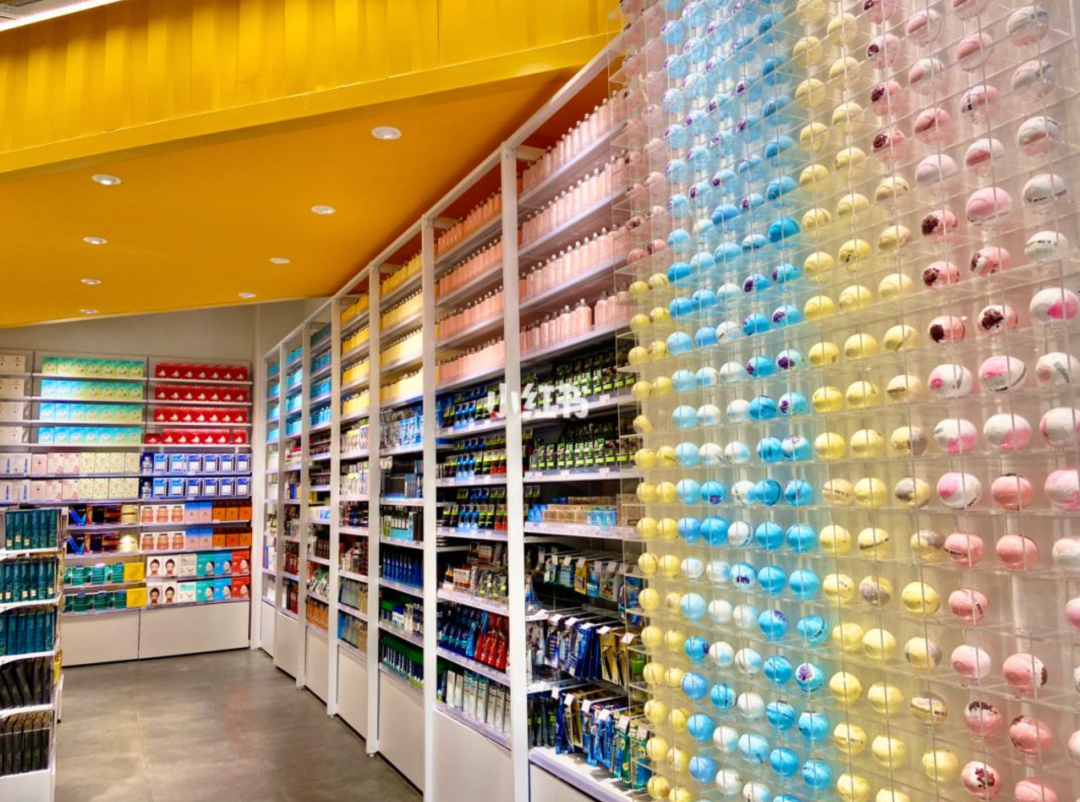 这类新业态的陈列不按常理出牌,饰品墙和美妆蛋墙直顶天花板,而普通门店传统货价高度也就1.4米~1.5米。
