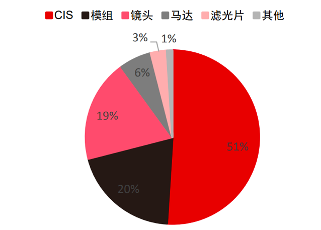 在这些零部件中,最核心的部件就是CIS和镜头,他们分别占据了整个镜头模组成本的50%和20%左右,而模组工艺这部分占成本的20%。