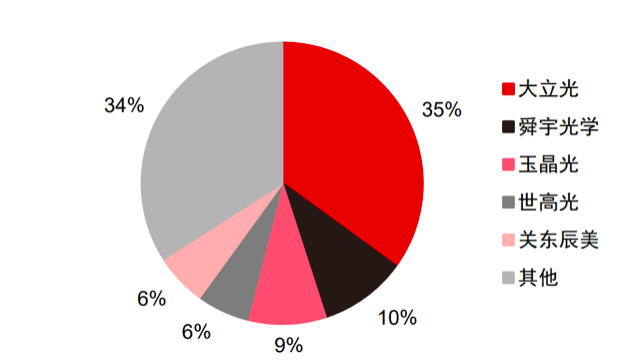 大立光、舜宇光学和玉晶光这前三位头部玩家占据了近55%的市场份额。