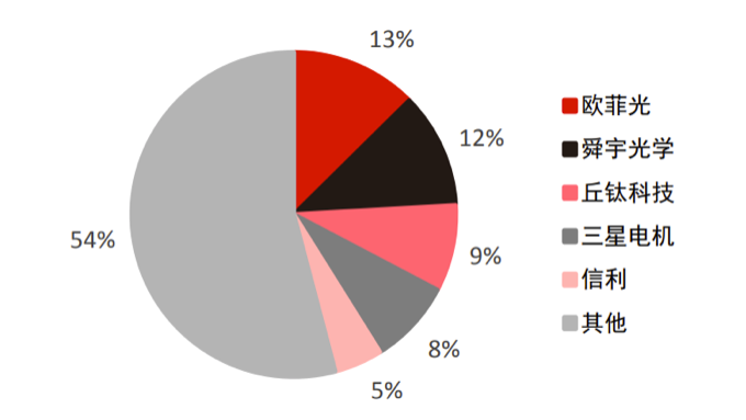 市场份额排名前五的厂商之间,其份额差距在1-2%左右,目前LG Innotek、三星电机、富士康为前三,国内的欧菲光排名第四,舜宇光学排名第五,丘钛科技也在前十名之中。