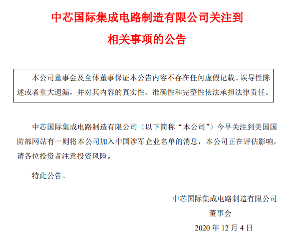 对此,中芯国际于12月4日上午发布公告称,今早关注到美国国防部网站有一则将本公司加入中国涉军企业名单的消息,美国国防部的禁令会在12月4日后的60天后生效。本公司正在评估影响,请各位投资者注意投资风险。