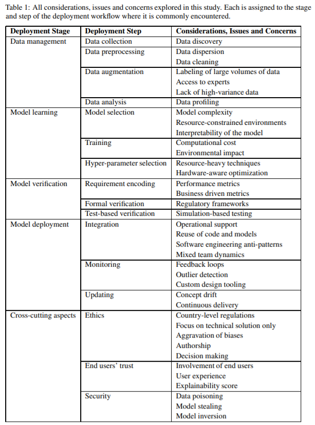 为确保本次调查聚焦当前挑战,剑桥大学研究人员仅考虑近 5 年发表的论文,只有少数例外。此外,他们还引用了其他类型的论文,例如实践指导报告、访谈研究、规则制度。需要注意的是,该论文没有进行新的访谈。该论文使用 Ashmore 等人 [14] 提出的机器学习部署工作流程定义。根据该定义,在工业环境中开发 ML 解决方案的过程包含 4 个阶段:以上每个阶段还可以进一步细分。但需要注意的是其顺序与现实场景未必完全相符,这些阶段并行执行或存在反馈循环是很正常的。本文探讨了每个阶段会出现的常见问题,以及会对各阶段带来影响的跨领域问题,参见下表: