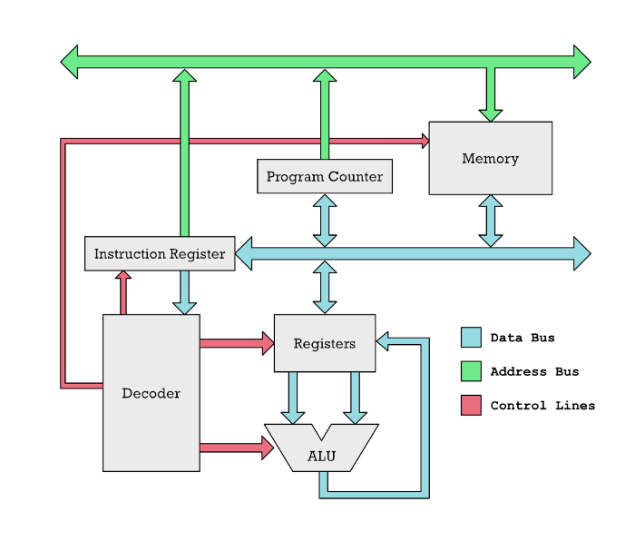 一个基本的 RISC CPU(不是 M1)。指令沿着蓝色箭头从内存移动到指令寄存器。解码器用来解读指令的内容,同时通过红色的控制线来连通 CPU 的各个部分。ALU 对寄存器中的数字进行加减运算。