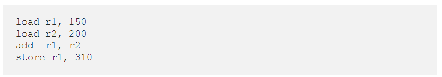此处的 r1 和 r2 是寄存器。当前的 RISC CPU 无法对不在寄存器中的数字执行示例中的运算,比如不能将在两个不同位置的内存中的数字相加,而是要将两个数字各放到一个单独的寄存器里。在上面的示例中,我们必须先将内存位置为 150 的数字放到寄存器 r1 中,然后将位置为 200 的数字放到 r2 中,只有这样,这两个数字才能依据 add r1, r2 指令进行加法运算。