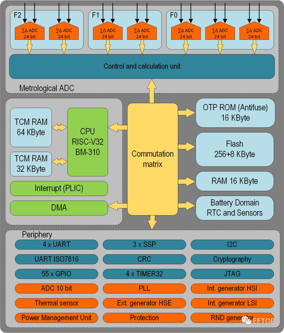 BM-310内核在CoreMark测试中的性能为3.0 CoreMark/MHz。因此,它可以与ARM Cortex-M3相媲美。同时,新芯片中的核心面积只有0.3m㎡,考虑到大部分计算功耗参数的任务都是由计量ADC的硬件控制器来完成的,因此主要处理能力的核心可以用于计量装置的通信任务。
