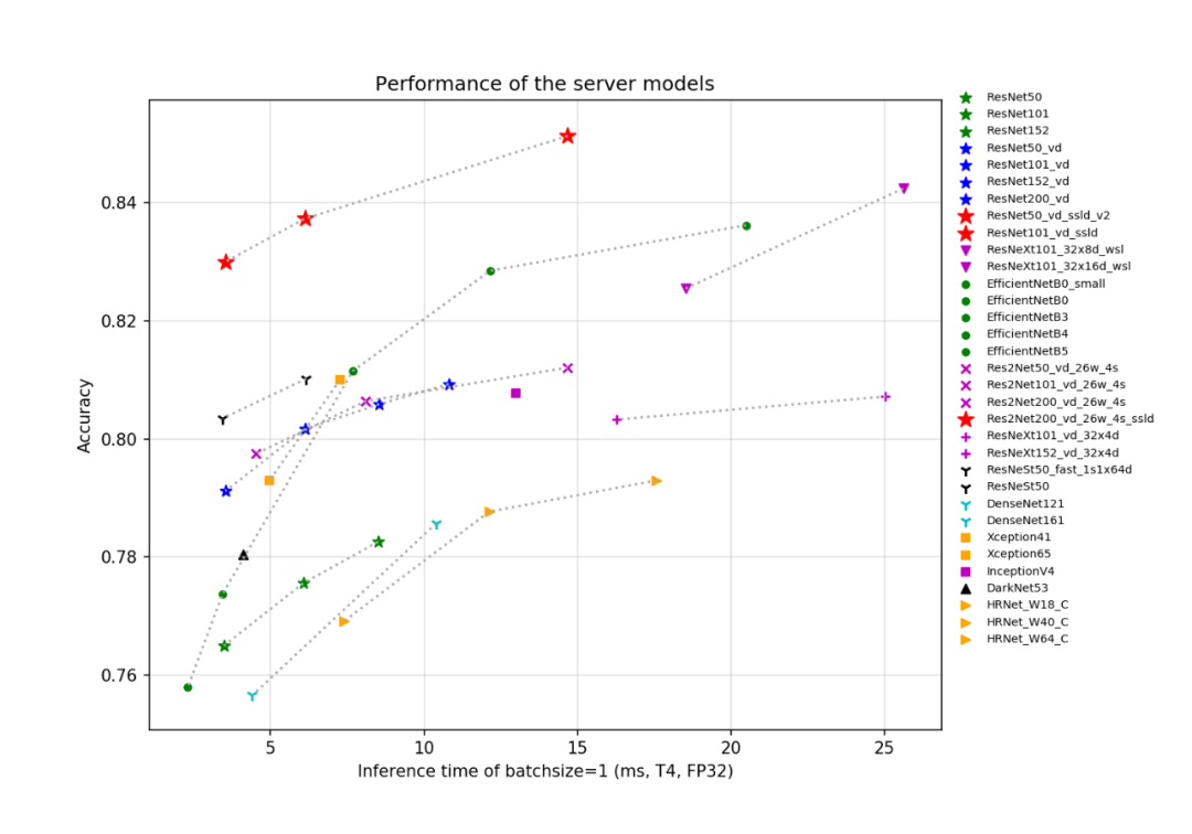 下面也分别给出了服务端模型和端侧模型在 T4 GPU 和骁龙 855 芯片上的预测耗时与精度曲线,大家可以根据自己的预测耗时或者精度要求,选择合适的分类网络。