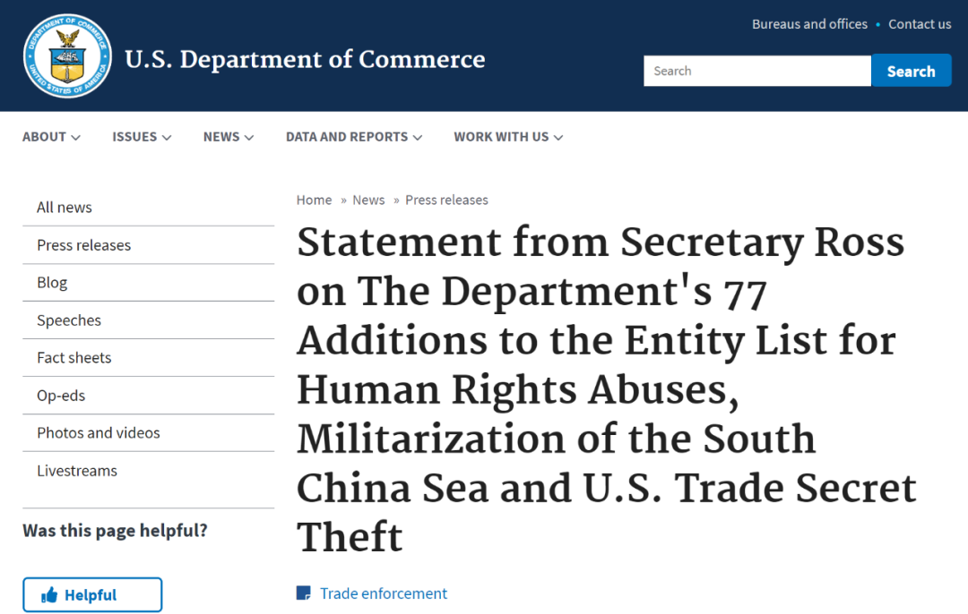 当地时间 12 月 18 日,美国商务部以「违反美国安全或外交政策利益驱动」为由将 77 个机构、公司与个人加入「实体清单」。在这其中,60 个为中国实体。美国商务部长威尔伯 · 罗斯称:「中国在境内外的欺凌行为损害了美国的国家安全利益,破坏了盟国和伙伴的主权。商务部将采取行动确保以公开和自由市场原则开发和生产的美国技术不会被用于恶意或滥用的目的。」本周五,路透社等媒体提前爆出了中芯国际被列入实体名单的消息,该行动被认为是特朗普政府增强其对中国强硬形象的最新努力。将更多中国公司列入名单,也是中美贸易战长期斗争的一部分。威尔伯 · 罗斯在一份声明中说:「商务部不允许先进的美国技术被用来帮助建立对手的军队。」