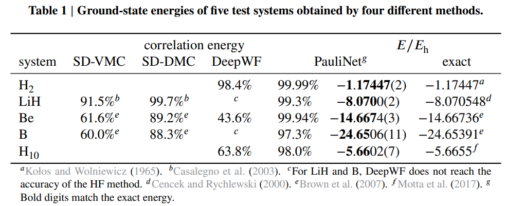在实验部分,研究者采用了用于 DeepWF(Han et al., 2019)的相同系统,具体为氢分子(H_2)、氢化锂(LiH)、铍(Be)以及硼(B)和线性氢链 H_10。研究者将 PauliNet 与 SD-VMC(singledeterminant variational, 标准单行列式变分蒙特卡罗)、SD-DMC(singledeterminant diffusion, 标准单行列式扩散蒙特卡罗)和 DeepWF 进行了比较。结果表明,PauliNet 的性能优于这三种用于原子、双原子分子和强相关氢链的 SOTA VMC 拟设方法,并且具有较高的计算效率。下表 1 为使用这四种不同方法时,H_2、LiH、Be、B 和 H_10 五种系统的基态能量对比: