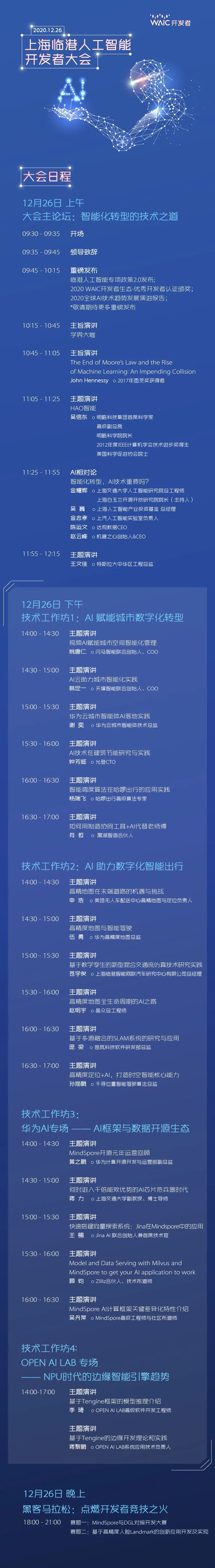 全球顶尖AI专家齐聚主论坛,解读智能化转型的技术之道。4场技术工作坊分享智慧城市、智能出行、华为开源生态与边缘智能引擎等话题,2场黑客松等你来战。