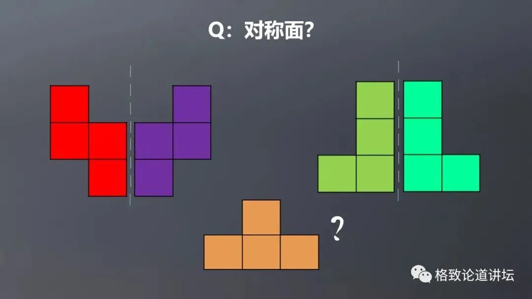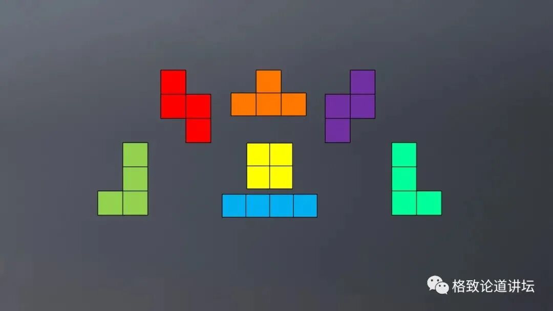 也就是说 ,“俄罗斯方块”是用了所有由四个方块拼成的、用边连接的一个形状,然后通过这些形状的变形,去做这个游戏。
