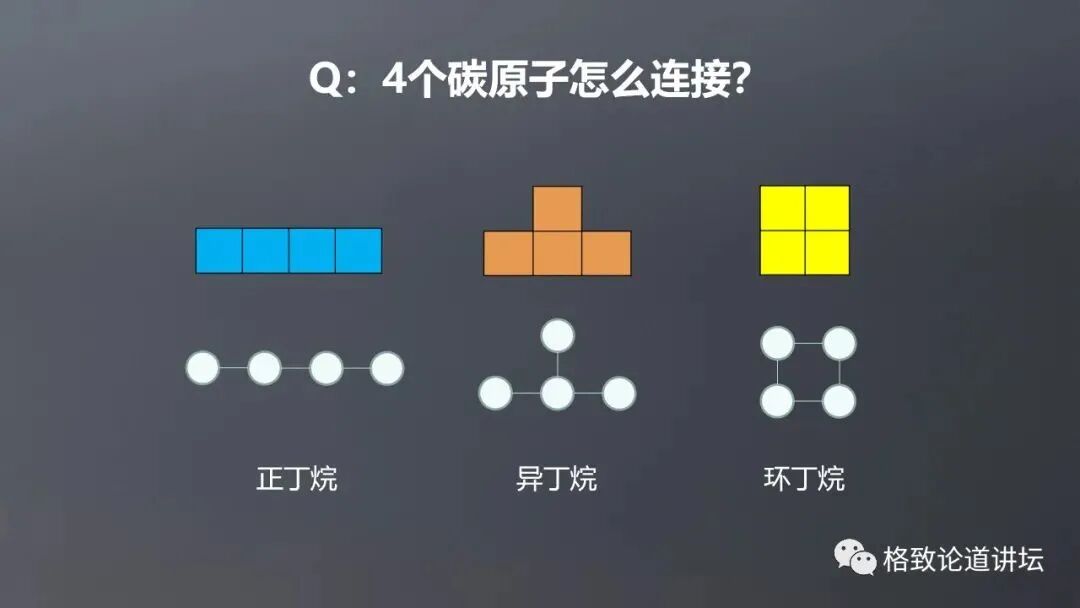 说到这,可能你会问:为什么四个方块能拼出七个,但是用四个碳原子却只有这三种结构呢?