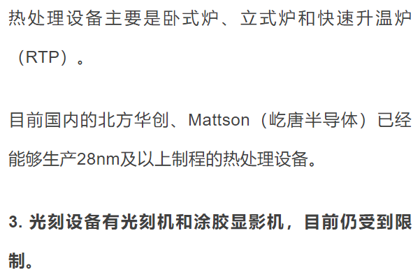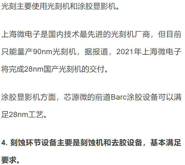 北方华创的硅刻蚀机在14nm工艺上取得重大进展,中微公司第二代电介质刻蚀设备已广泛应用于28到7nm后段制程以及10nm前段制程。