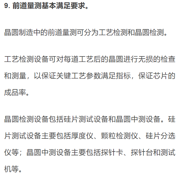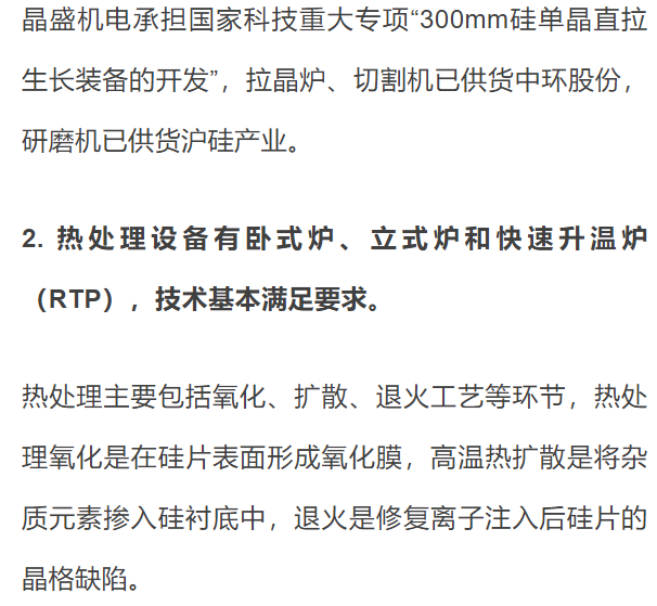 刻蚀之后使用去胶设备将表面遗留的光刻胶去除。屹唐半导体的去胶设备已经进入了5nm生产线。晶圆制造中需要将杂质离子(如硼离子、磷离子)掺入被刻蚀后的特定硅片区域中,从而形成PN结、电阻、欧姆接触等。离子注入是使带电粒子(离子)高速轰击硅片并将其注入硅衬底的方法。中电科旗下北京中科信的12英寸离子注入机已进入中芯国际生产线,工艺覆盖至28nm。万业企业旗下凯世通的离子注入机已突破3nm工艺,主要参数均优于国外同类产品。6. 薄膜沉积环节主要是PVD、CVD设备,基本满足要求。绝缘薄膜(如SiO2)、半导体薄膜(如多晶硅)、导电薄膜(如金属)是芯片中的重要物质,薄膜沉积是各类薄膜形成的最主要方式。薄膜沉积工艺分为物理气相沉积(PVD)、化学气相沉积(CVD)和外延三大类。PVD多应用于金属薄膜的沉积,CVD可应用于绝缘薄膜、半导体薄膜和导电膜层的沉积,外延是在硅片表面生长单晶薄膜的工艺。另外,ALD属于CVD的一种,是目前最先进的薄膜沉积技术。北方华创的PVD设备已经用于28nm生产线中,14nm工艺设备也已实现重大进展。沈阳拓荆的PECVD设备已在中芯国际40-28nm产线使用,ALD设备也在14nm工艺产线通过验证。7. 化学机械抛光环节设备主要是抛光机,目前仍受限制。晶圆制造需要对硅片表面进行平坦化处理,不然会严重影响芯片的结构及良率。化学机械抛光(CMP)结合了化学作用与机械作用,使硅片表面材料与研磨液发生化学反应的同时,在研磨头的压力作用下进行抛光,最终使硅片表面实现平坦化。华海清科和中电科45所均参与02专项项目——“28-14nm抛光设备及工艺、配套材料产业化”,研发300mm晶圆28-14nm“干进干出”CMP整机设备及结合配套材料的成套工艺。目前华海清科的抛光机已进入中芯国际生产线,同时中电科45所8英寸设备正在被中芯国际验证。几乎所有工艺流程都需要清洗环节,清洗步骤占半导体工艺所有步骤的1/3,最多可达到200次。清洗机是将硅片表面的颗粒、有机物、金属杂质等污染物去除,以获得所需洁净表面的工艺设备。北方华创、盛美半导体、至纯科技、芯源微的清洗装备均可实现国产替代,其中盛美半导体是国内唯一进入14nm产线验证的清洗设备厂商。