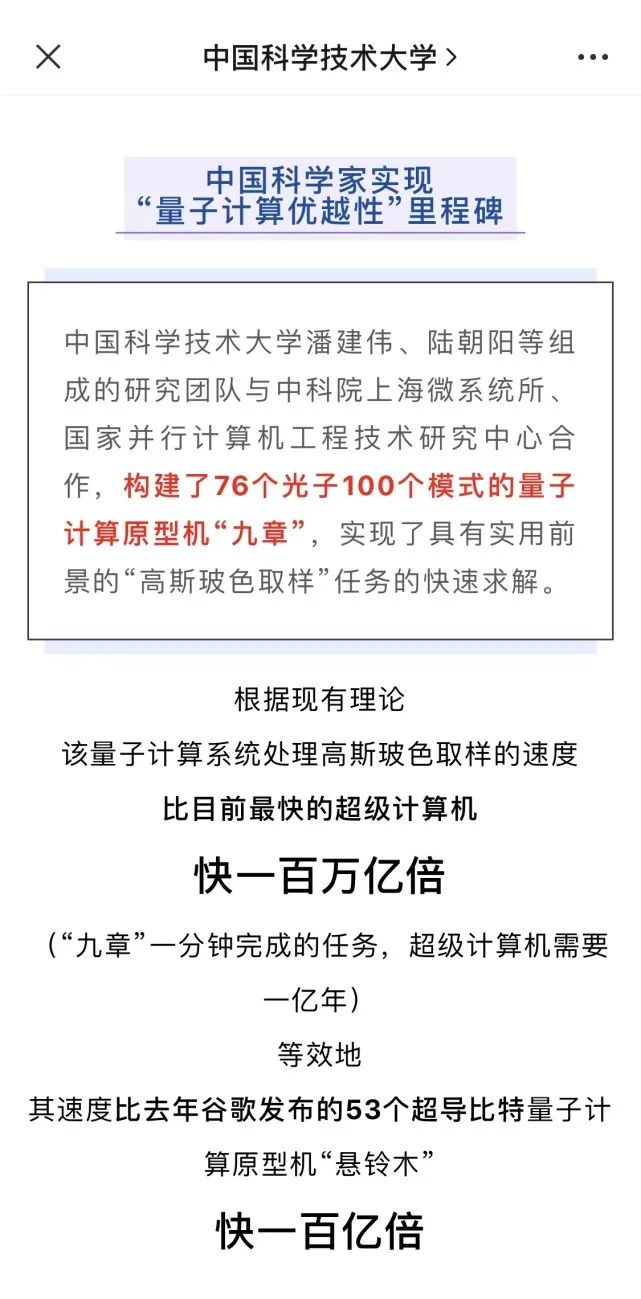 这个于12月4日揭开面纱的光量子计算模型机名为“九章”,是世界上第二次达到加州理工学院教授普雷斯基尔提出的“量子霸权”(Quantum supremacy)标准的量子计算实验。