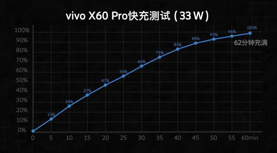 我们实测从1%充到100%,用时62分钟,70%电量以下,功率都在20W以上,最高功率在28W左右。充至85%左右会降到10W,整个充电时间算是中等水准。