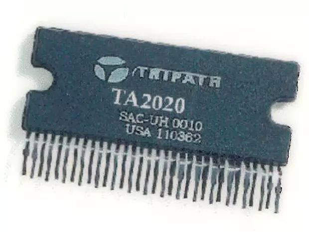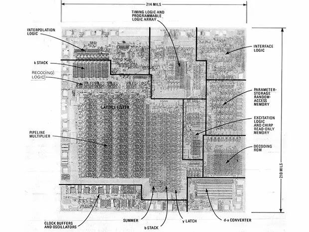 Micronas Semiconductor MAS3507 MP3 Decoder在 iPod 出现之前,是Diamond Rio PMP300。PMP300于1998年推出,几乎立刻就火了,不过这一热潮很快就消减了。不过,这个播放器有一件事很重要,就是它支持 MAS3507 MP3解码芯片——一个基于RISC的数字信号处理器,具有为音频压缩和解压缩优化的指令集。它的开发者是Micronas(现在是TDK-Micronas),它让Rio能够将十多首歌曲压缩到其闪存中。对于今天的标准来说可能有点可笑,但在当时相比便携式CD播放器已经足够有竞争力了。Rio以及它的后续产品为iPod铺平了道路,现在你已经能够在口袋里装上数千首歌曲。正如这个 Micronas 的设计文件所显示的,MAS3507是只为做好一件事设计的,即只能很好地解码 MPEG Audio Layer III(即MP3)数据。Texas Instruments TMC0281 Speech Synthesizer如果没有TMC0281,E.T.可能永远没办法“打电话回家”。因为 TMC0281 是世界上第一款单芯片语音合成器,是德州仪器的 Speak&Spell 学习玩具的“心脏”(或者应该说是“嘴巴”)?在1982年的《E.T.外星人》电影中,外星人E.T.黑进玩具中,搭建了一个星际通讯设备。今天,我们已经越来越习惯与消费电子产品交谈;TMC0281 是无处不在的合成语音世界的第一步。TMC0281于1978年发布,使用被称为线性预测编码(linear predictive coding,LPC)的技术产生语音,所产生的声音是一些嗡嗡声、嘶嘶声和爆裂声的组合。对于“产生语音”这件被认为是“不可能在集成电路中实现的”的事情,这是一个令人惊讶的解决方案。TMC0281的变体型号被用于雅达利的街机游戏和克莱斯勒的K型车。2001年,德州仪器将它的语音合成芯片生产线卖给Sensory公司,Sensory在2007年底停产这个芯片。不过,在eBay上花50美元左右可以买到品相非常不错的 Speak&Spell 玩具。Tripath Technology 的 TA2020 音频放大器(1998)