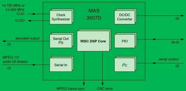Intersil ICL8038 Waveform GeneratorIntersil的ICL8038波形发生器为消费电子产品带来了复杂的声音一个好的基本波形——随时间变化的电压——是构建更复杂行为的原材料。Intersil的ICL8038 集成电路的设计是为了方便地获得精确的波形,能够同时产生正弦波、矩形波和锯齿波等周期信号,只需要很少的外部元件。最初,ICL8038 被嘲笑性能有限,而且具有表现不稳定的倾向。确实,这个芯片有点不可靠。但共生是们很快学会了如何可靠地使用它,然后8038取得了重大的成功,最终销售了数百万个,并被用在无数应用程序中——包括“电话飞克”(phreaker)们在20世纪80年代使用的“蓝盒子”(blue boxes)。Intersil 公司在2002年停产了8083,但爱好者们至今仍在收集 ICL8038,用来自制函数发生器和模块化模拟合成器。微开半导体MAS3507 MP3解码器(1997)