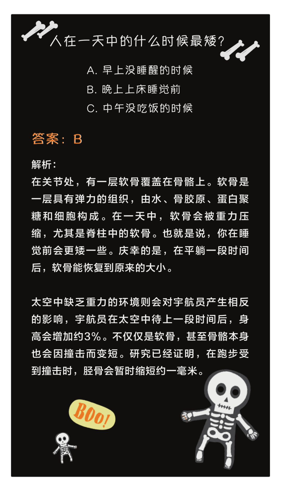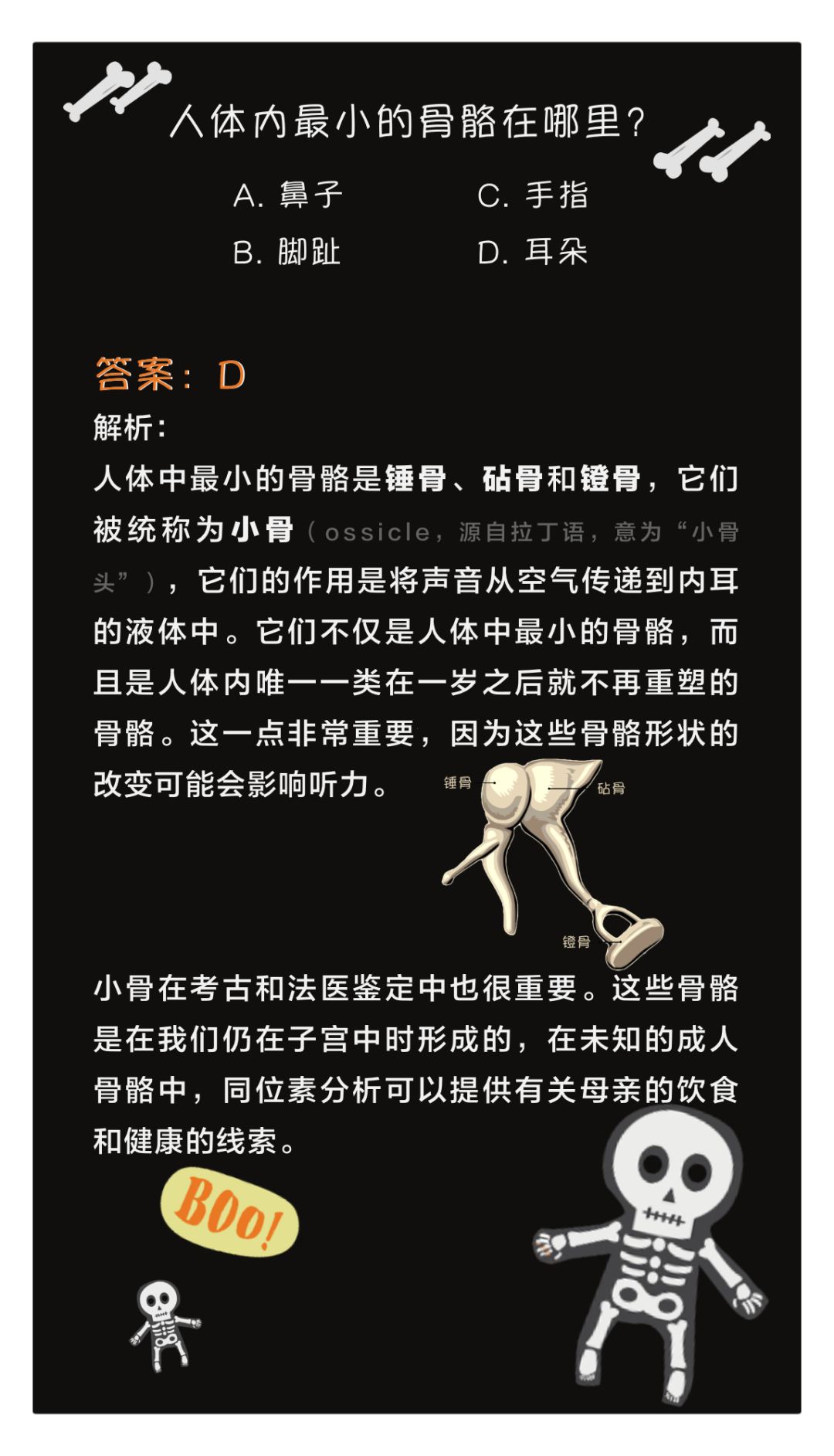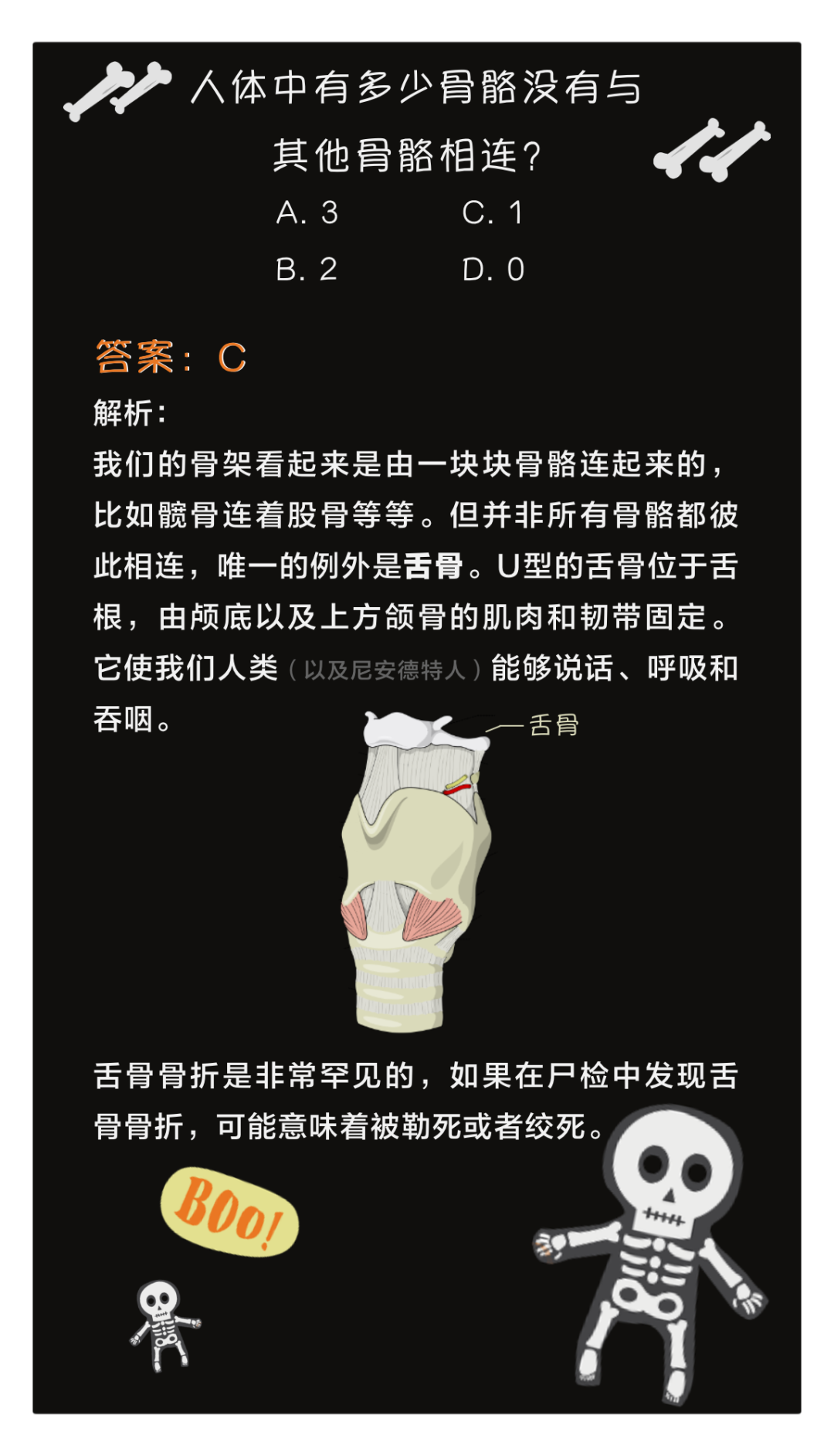 选题策划:杭州小张选题来源:Adam Taylor(兰卡斯特大学医学解剖学学习中心教授及主任),Rebecca Shepherd(兰卡斯特大学博士研究生);Six fun facts about the human skeleton, The Conversation;https://theconversation.com/six-fun-facts-about-the-human-skeleton-123711文字整理:新年新气象的Takeko动画视觉:Takeko插图设计:封面也是Takeko做的哦的Takeko 图片来源:骨骼:Pixabay骨架:pixabay 机器人:nounproject舌骨:Olek Remesz / Wikimedia Commons骨髓:Wang, H. et al., MR Imaging of Pediatric Bone Marrow小骨:Marc Giacone / Wikimedia Commons