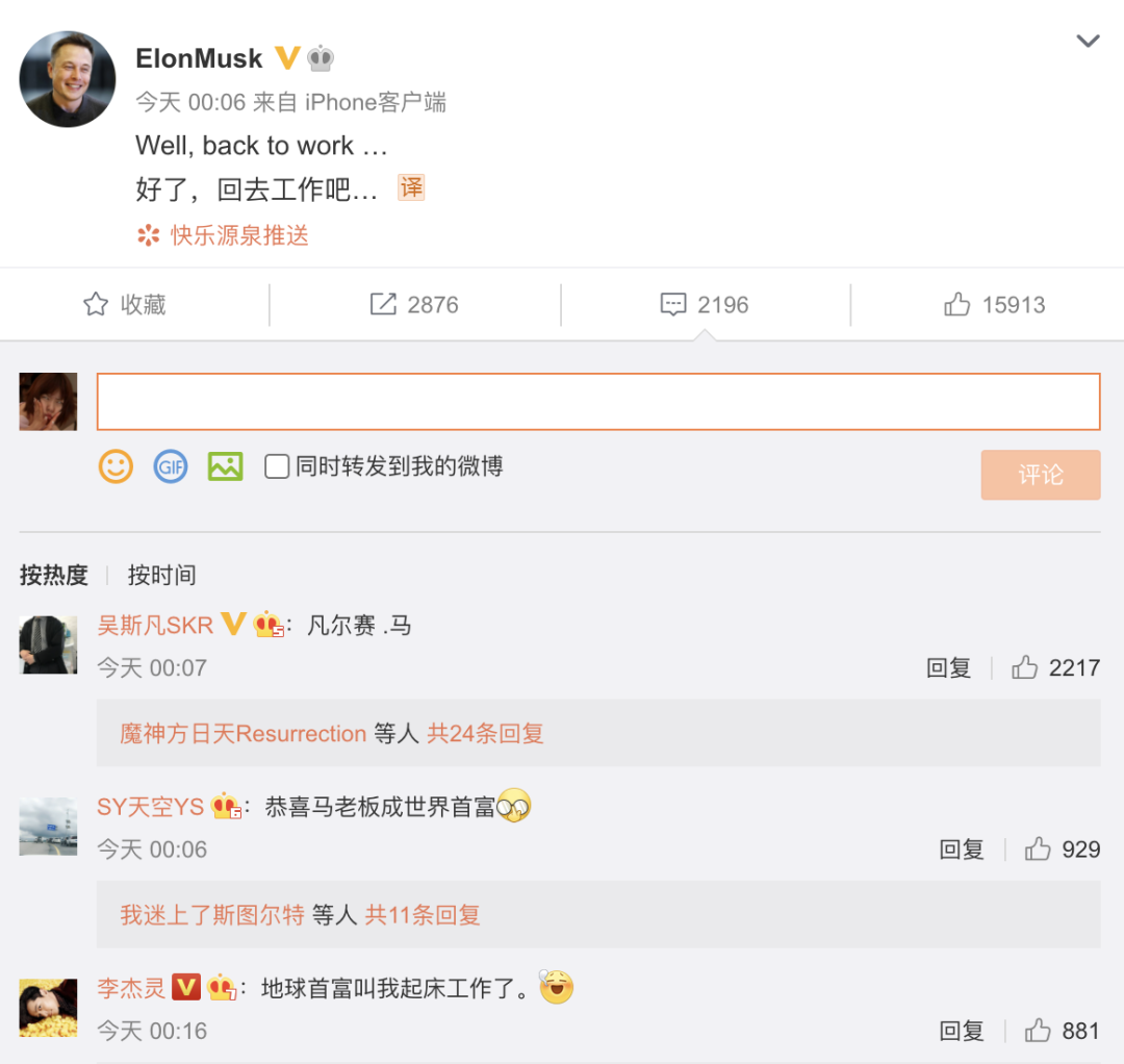 当地时间 1 月 7 日,外媒报道称根据彭博亿万富豪指数,美国特斯拉和 SpaceX 公司首席执行官埃隆·马斯克当日取代亚马逊创始人杰夫·贝索斯成为全球首富。特斯拉股价 7 日收于 816.04 美元,上涨近 8%。公司市值已超 7600 亿美元,马斯克的净资产也增至 1950 亿美元,比贝索斯高出 100 亿美元。