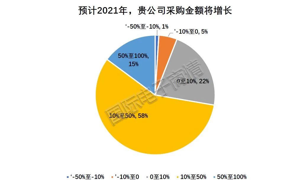 根据《国际电子商情》的调查结果显示,相比2020年,94%的采购表示2021年采购金额会上涨,其中采购金额增长比例在10%-50%的企业占比高达58%,增长50%-100%占比高达15%,仅有6%的采购表示2021年公司采购金额会下降。综上所述,业界对2021年全年的经济增长仍保持乐观心态,尤其是随着全球疫苗研发进程加快以及初步投入使用,疫情的有效抑制,将提振电子制造业恢复的速度和信心!