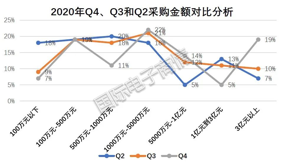 (1)3亿元以上采购额的企业占比直线上升,由Q3的10%上升到Q4的19%;(2)1000万元-1亿元采购金额的企业占比较Q3均有微幅增长;(3)1-3亿元采购金额的企业占比有显著下滑,由Q3的11%降低到Q4的5%。