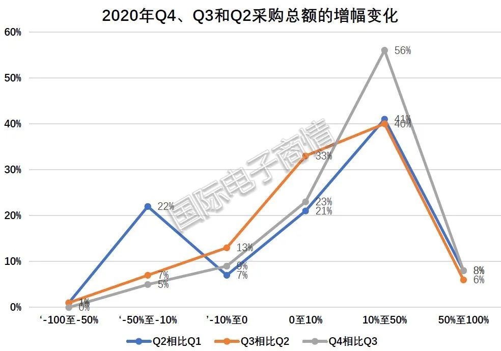 从采购总额的增幅变化来看,Q4采购总额增速10%-50%的企业占比几乎一骑绝尘,由Q3的41%飙升到Q4的56%;增速50%以上的企业占比几乎不变;增速在10%以下的企业占比明显减少。